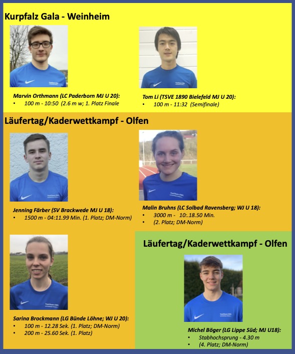 Sarina Brockmann (LG Bünde Löhne) testete sich nach der WM-Quali mit der Nationalstaffel im Einzelsprint. Gegenwind verhinderte leider gute Zeiten; immerhin qualifizierte sie sich in 12.28 Sekunden über 100 Meter für die Jugend-DM. Ihre erzielten 25.60 Sekunden auf der 200-Meter Strecke sollte sie schon bald deutlich unterbieten können.