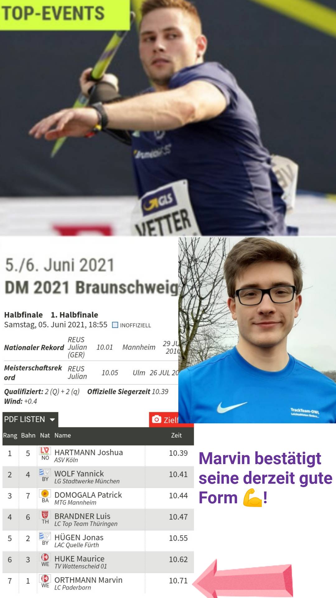 Marvin Orthmann (LC Paderborn) zeigte die erforderliche Nervenstärke. Als NK1 U20-Kaderathlet wurde er für die „großen“ Deutschen Meisterschaften, die – wie im letzten Jahr – im Rahmen der Finals in Braunschweig durchgeführt wurden, zugelassen. Mit der schwächsten Leistung gemeldet konnte sein Ziel natürlich nur lauten, sich bestmöglich zu präsentieren und seine Bestleistung (10.63 Sekunden) anzugreifen. Letzteres gelang nicht; als Letzter seines Vorlaufs erreichte er reguläre 10.71 Sekunden und belegte in der Gesamtwertung den 18. Platz.