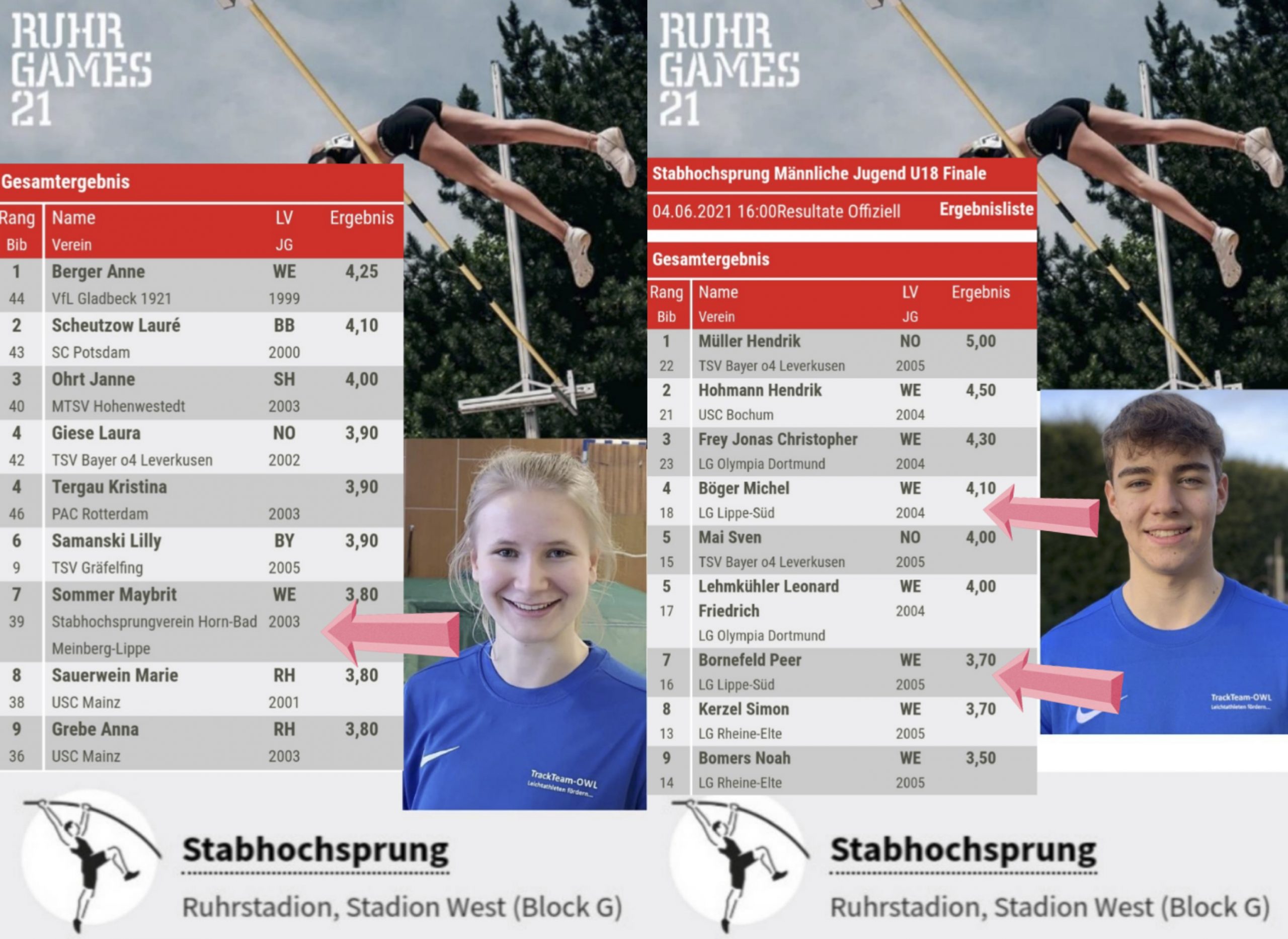 Während der RuhrGames 2021 zeigten unsere lippischen Stabhochspringer*innen, was sie inzwischen können und bestachen vor allem durch Beständigkeit. Stipendiat Michel Böger (LG Lippe Süd) belegte dabei mit übersprungenen 4.10 Meter den vierten Platz in der von dem Leverkusener Hendrik Müller dominierten U18-Wettbewerb, der immerhin exzellente 5.00 Meter überwand. Im gleichen Wettkampf belegte Teamkamerad Peer Bornefeld mit 3.70 Meter den siebten Platz. In der weiblichen Jugend U20 steigerte sich Michels weibliches Pendant Maybrit Sommer vom erst kürzlich gegründeten Stabhochsprungverein Horn-Bad Meinberg auf die saisonale Besthöhe von 3.80 Meter, wurde dabei Siebte und deutete an, dass sie schon bald ihre Bestleistung von 4.00 Meter erreichen wird.