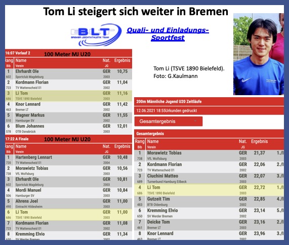 Bremen war bislang immer ein Ort, an dem so einige ostwestfälische Athleten*innen sehr gute Erfahrungen gesammelt und auch Bestleistungen aufgestellt haben. So zog es Tom Li (TSVE 1890 Bielefeld) insgesamt zum dritten und in diesem Jahr zum zweiten Mal in Folge in die Wesermetropole. Erneut startete er bei einem Einladungs- und Qualifikationsmeeting der Bremer LT auf der schnellen TSV Komet Arsten Bahn und stellte sich der deutschen U20-Jugend-Spitzenklasse. In 100-Meter Vorlauf mit regulären 11.16 Sekunden eine Saisonbestzeit erzielend qualifizierte er sich für das A-Finale, das er noch recht deutlich hinter dem U18-Spitzensprinter Lennart Hartenberg (10.48 Sekunden, TV Wattenscheid) als Gesamtsechster in ausgezeichneten 11.00 Sekunden abschloss. Leider ein bitterer Wermutstropfen für alle Sprinter: 3.0 Meter Rückenwind verhinderte eine offizielle Anerkennung dieser tollen Leistungen. Am Abend verpulverisierte er als Sieger seines Zeitlaufes und als Gesamtvierter seine bisherige 200-Meter Bestzeit (23.50 Sekunden regulär, 23.28 Sekunden windunterstützt) um eine halbe Sekunde und erzielte ohne spezielle Vorbereitung 22.72 Sekunden.