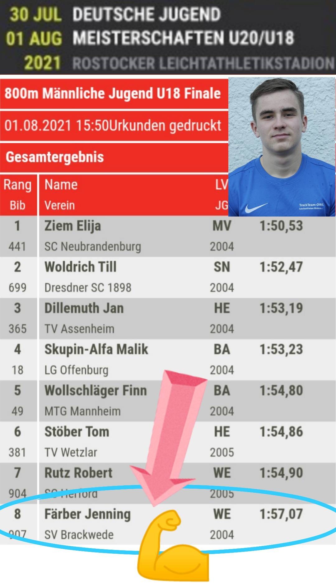 Aufgrund seiner diesjährigen Verbesserungen konnte es für 800-Meter Läufer Jenning Färber (SV Brackwede) nur ein Ziel geben: der Finaleinzug mit dem Versuch, sich möglichst optimal in seinem letzten U18-Jahr zu platzieren. Mit dem 8. Platz gelang ihm dies auch. In der OWL-Wertung war lediglich der starke Herforder Robert Rutz (SC Herford) als bester Ostwestfale vor ihm.