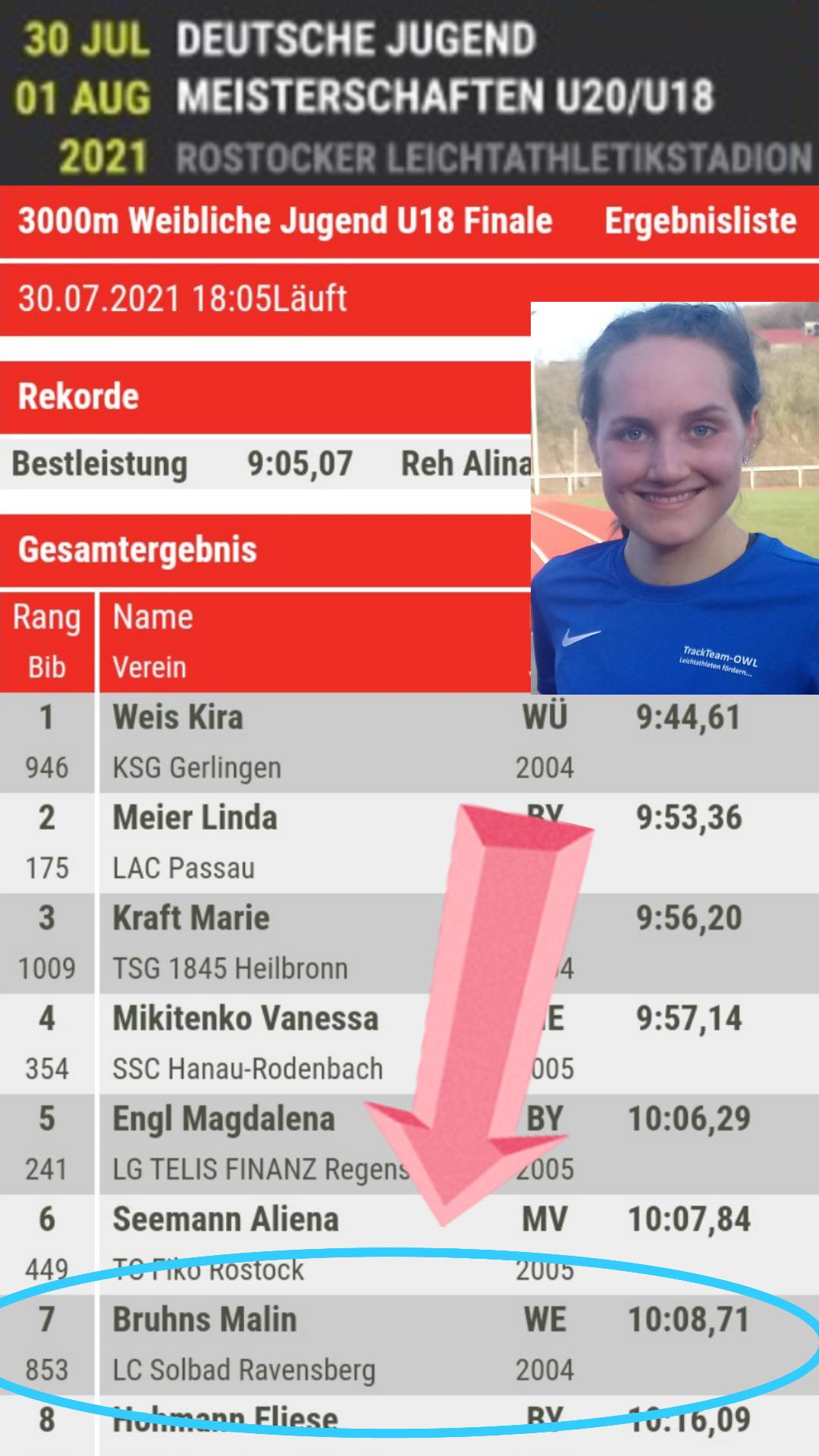 Als Siebente im 3000-Meter Finale der U18 erlangte Malin Bruhns (LC Solbad Ravensberg) ihre bislang beste DM-Platzierung. Dass Saisonleistungen bzw. Bestleistungen noch lange nichts über ein Turnierergebnis, in dem es vorrangig um Platzierungen geht, aussagt, weiß die ehrgeizige Läuferin natürlich. Und so hat sie, so gut es eben ging, mit der Spitze sehr gut mitgehalten. Am Ende, insbersondere auf der letzten Runde, fehlte jedoch das für eine Spitzenplatzierung nötige Spurtvermögen. Dennoch konnte sie mit der für sie drittbesten Zeit eine sehr gute Leistung in ihrem letzten U18-Jahr erzielen.