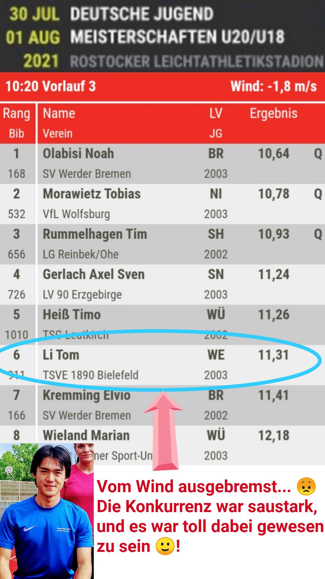 Mit einem etwas enttäuschendem Vorlaufergebnis fuhr der einzige Bielefelder Sprinter Tom Li (TSVE 1890 Bielefeld) wieder heim. Ein stressiges Abitur, das er als Jahrgangsbester abschloss und ein nach einem vergleichsweise gutem Einstieg eher holpriger und ein mit Pech verbundener Saisonverlauf konnte in der Abschlussphase nicht kompensiert werden. Dennoch gelang ihm im ersten U20-Jahr die Quali für die Jugend-DM, wo er sich mutig einer fast schon übermächtigen Konkurrenz stellte. Die ersten 30 Meter waren recht gut, wenn auch etwas unrythmisch, dazu kam böiger Gegenwind, der seine Leistung leider negativ beeinträchtigte.