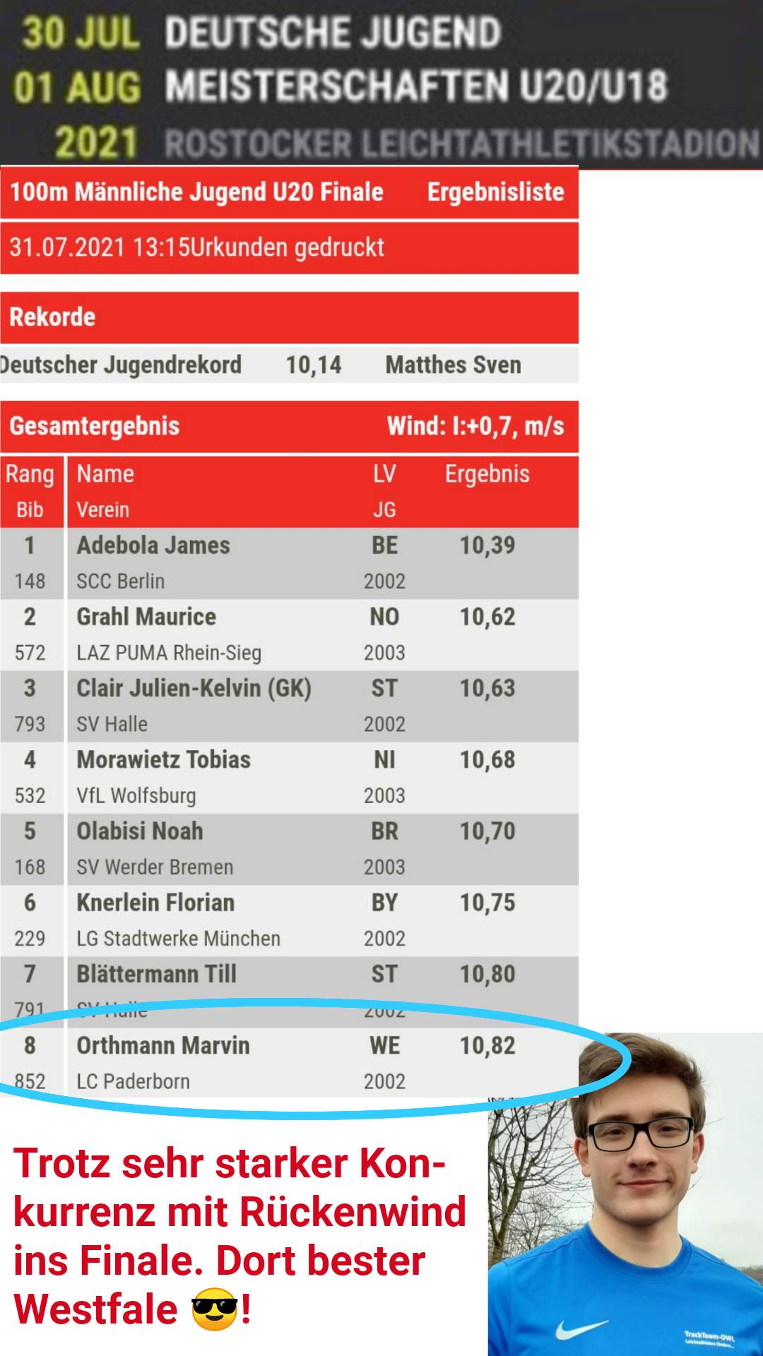 U20-Sprinter Marvin Orthmann (LC Paderborn) hatte sich für dieses Jahr deutlich mehr vorgenommen. Die Sprintkonkurrenz zeigte sich jedoch bereits in den Vorläufen schon sehr stark. Ihm gelang dennoch der Finaleinzug, den er als schnellster OWL-Sprinter mit Platz 8 abschloss.
