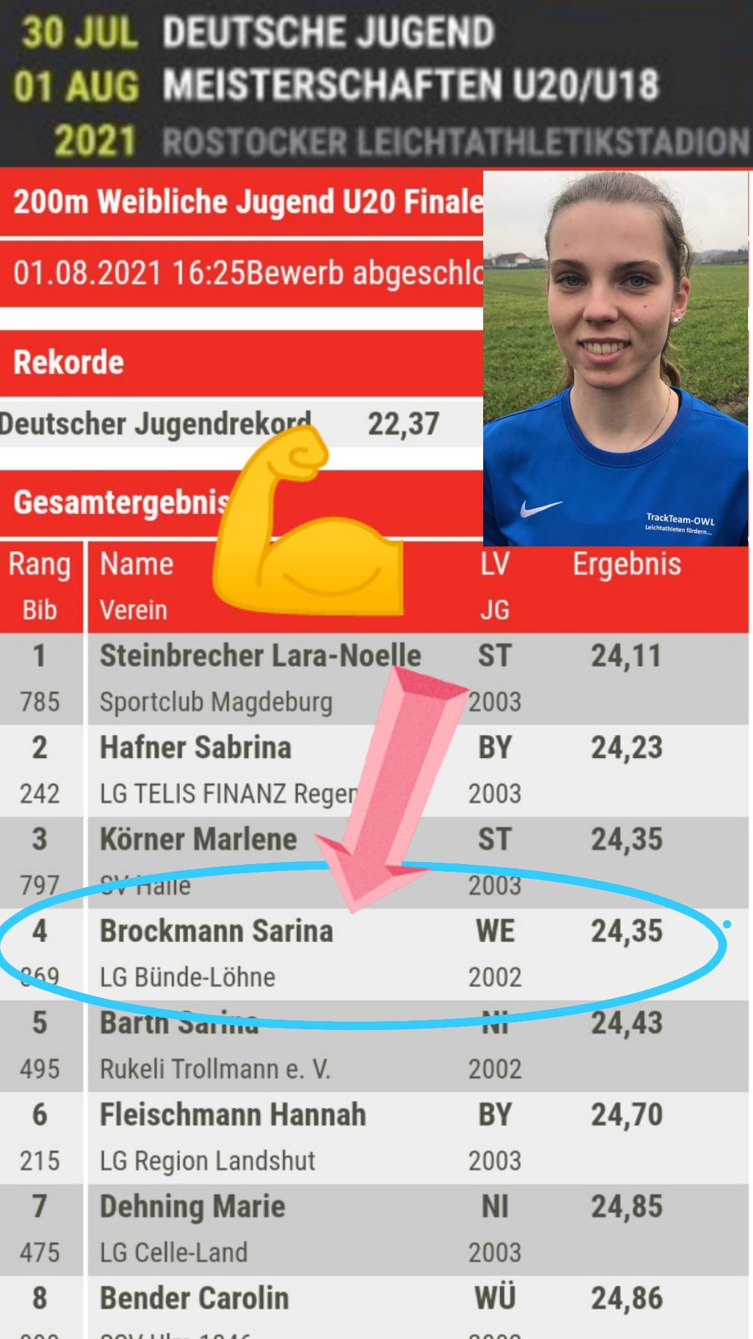 Als schnellste Ostwestfälin und mit der besten Finalplatzierung (Platz 4) in der U20 durfte sich 200-Meter Läuferin Sarina Brockmann (LG Bünde-Löhne) schmücken. Lediglich eine Tausendstel trennte sie von Bronze, wie sich nach eingehender Analyse des Zieleinlaufs herausstellte. Zwar konnte sich Sarina gegenüber letztem Jahr, wo sie sich mit 24.08 Sekunden sehr dicht an die Normen für die Junioren-EM und -WM annäherte nicht verbessern, dennoch ein Achtungserfolg.