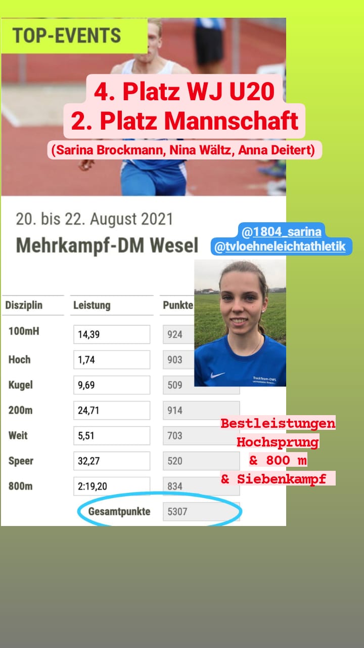 Mit einer neuen Gesamtbestleistung von 5307 Punkten, die insbesondere auf Einzelbestleistungen im Hochsprung (1.74 m) – und dies völlig unerwartet – im abschliessenden 800-Meter Lauf basierte, konnte Sarina den stolzen 4. Platz erringen. Sollten die Schwächen in den Wurfdisziplinen und im Weitsprung beseitigt werden, dürfen wir bald ein neues Siebenkampftalent in Ostwestfalen bewundern, das vielleicht nach der Olympiazweiten von 2012 Lilli Schwarzkopf (damals LC Paderborn) mehr als 6000 Punkte erreichen könnte. Die für den Nachwuchsmehrkampf bekannte Region Bünde/Löhne war ebenfalls im Mannschaftsvergleich erfolgreich. Immerhin holte das Team der LG Bünde-Löhne Silber in der Mannschaftswertung, wobei Sarina hier einen sehr gewichtigen Beitrag lieferte.
