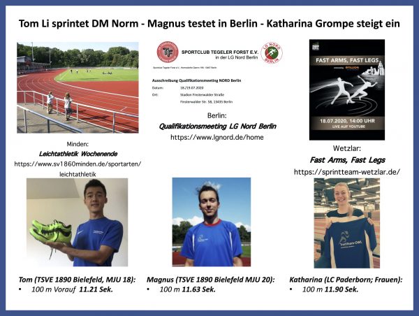 Minden: Tom testet neue Spikes und unterbietet 100 m Norm für DM U18. Wetzlar: Kathrarina Grompe rennt nach mehrjähriger Pause 100 m. Berlin: Magnus findet noch rechtzeitig das Stadion und macht guten Testwettkampf. Tom Li (TSVE 1890 Bielefeld) startete beim Leichtathletik Wochenende in Minden: Den 100 m Vorlauf gewann er locker mit der zweitbesten Zeit