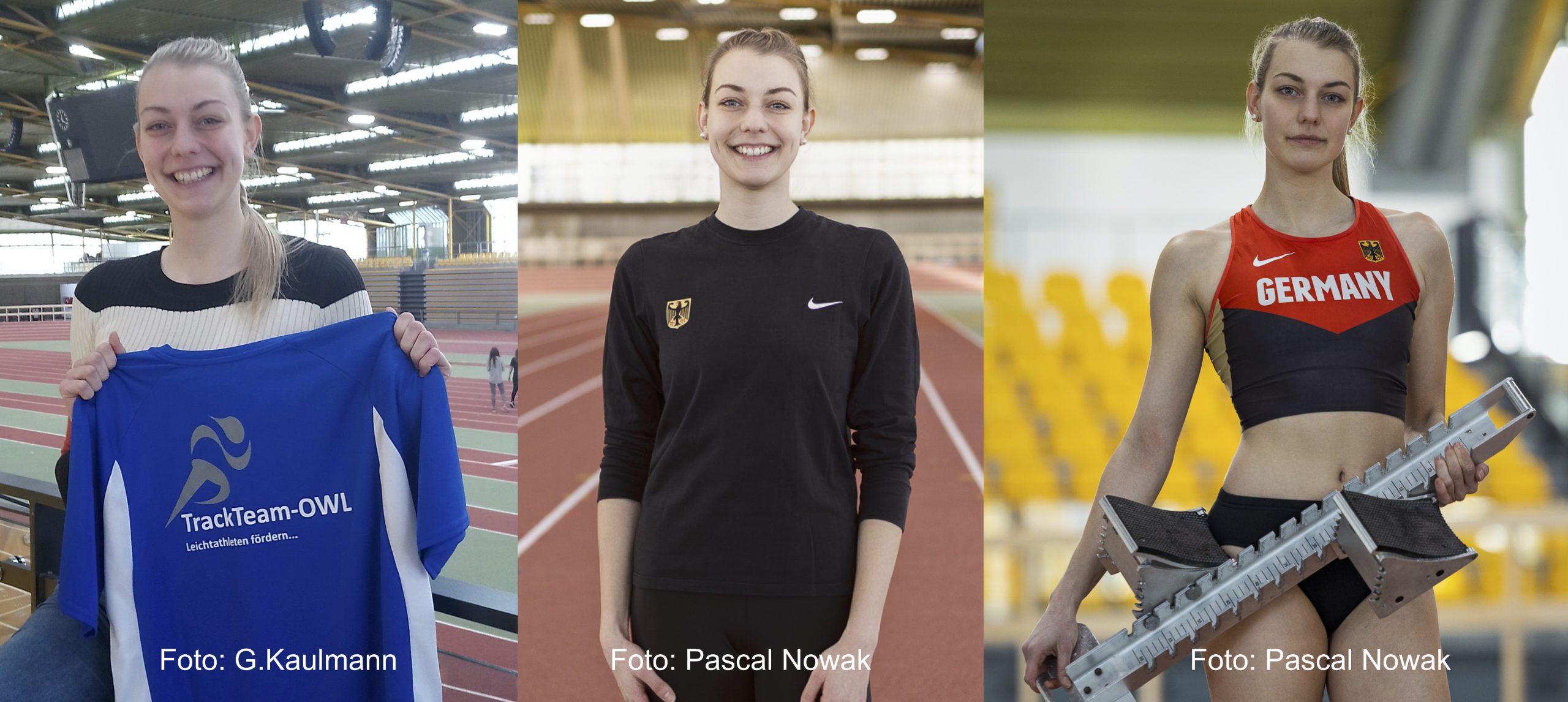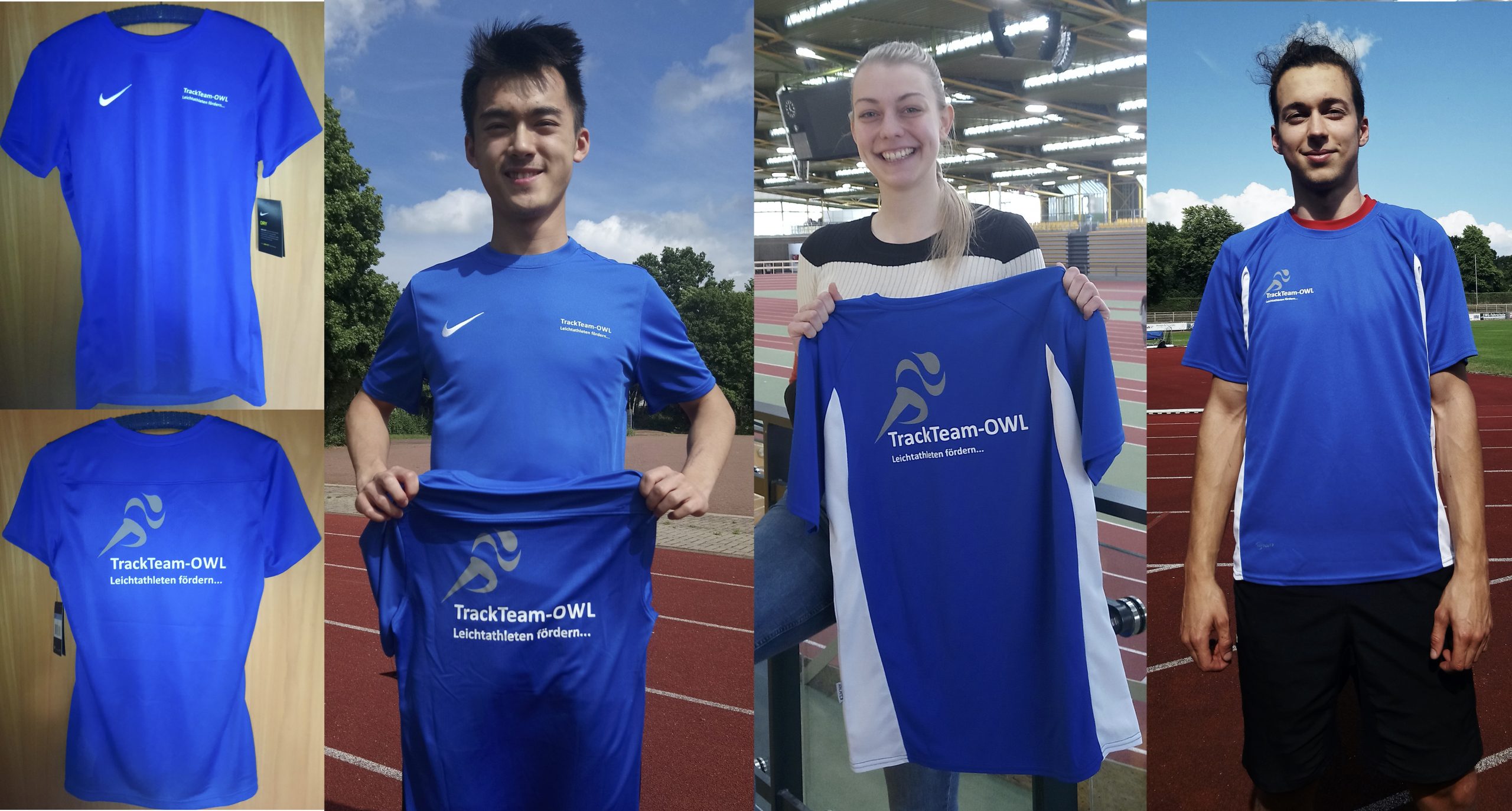 Die neuen TrackTeam-OWL Shirts sind endlich da ! Tom freut sich riesig über das neue Outfit. Rechts neben ihm tragen Katharina Grompe und Magnus Meier noch das alte Shirt, das leider nicht mehr erhältlich ist. An dieser Stelle einen herzlichen Dank für das schöne und solide Druckerzeugnis durch „Freie Form Burghoff & Pohlmeier“ !
