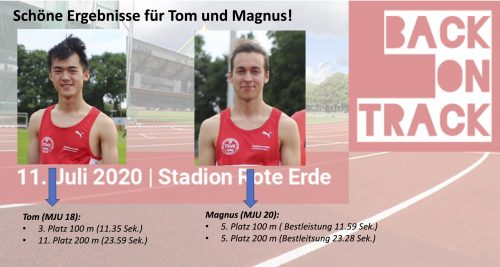 Mit schönen Ergebnissen kehrte eine kleine Abordnung des TSVE vom #backontrack Meeting der LGO Dortmund (Samstag, 11.07.2020) zurück. Für Magnus Meier schlägt nach längerer Pause das Training gut an: 5. Platz in der Gesamtwertung 100 m der MJU 20 nebst Bestleistung (11.59 Sek.). Ebenfalls mit Bestleistung wurde er Gesamtfünfter über die doppelte Distanz. Im Ziel