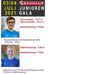 Wie jedes Jahr, fallen die endgültigen Entscheidungen über Nominierungen für internationale U20-Juniorenmeisterschaften nach den Wettkämpfen bei der BAUHAUS U20-Junioren Gala (Mannheim), die dieses Jahr am 03./04. Juli im Mannheiner Michael-Hoffmann-Stadion durchgeführt wurden. Hochmotiviert hofften Marvin Orthmann (LC Paderborn) und Maybrit Sommer (Stabhochsprungverein Horn-Bad Meinberg-Lippe) auf weitere Leistungssteigerungen, die sich leider nicht erfüllten. Mit im 100-Meter