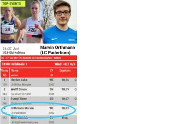 Mit Marvin Orthmann (LC Paderborn) und Maybrit Sommer (Stabhochsprungverein Horn-Bad Meinberg-Lippe) starteten am 26./27. Juni zwei hoffnungsvolle, ostwestfälische Jugendtalente bei den Deutschen U23-Meisterschaften, die dieses Jahr unter Corona-Bedingungen in Koblenz durchgeführt wurden. Die Teilnehmerfelder waren auschreibungsbedingt sehr klein, was die Chancen auf Finalteilnahme deutlich erhöhte. Marvin war als Jüngster mit der schlechtesten Qualifikationszeit für den