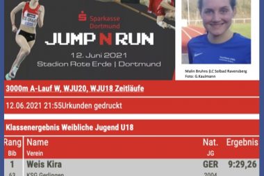Es hat mehrere Anläufe gebraucht, doch schließlich ging der Traum in Dortmund in Erfüllung. Beim Dortmunder Sparkassen Jump’n’Run Meeting startete Malin Bruhns (LC Solbad Ravensberg) in einem gemischten 3000-Meter Rennen und erzielte ihre erste Zeit unter 10 Minuten. Nach 9:57.66 Minuten überquerte sie die Ziellinie. In der U18-Konkurrenz war lediglich die gleichaltrige Spitzenläuferin Kira Weis