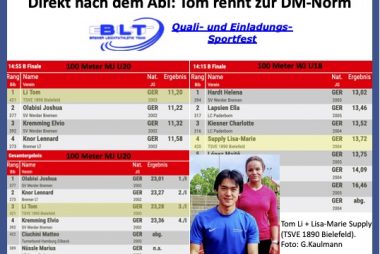 Noch während der Abiturprüfungen lief Bielefelds schnellster Sprinter Tom Li bei der internationalen Kurpfalz Gala in Weinheim, wo er als einer der ganz wenigen Ostwestfalen einen Startplatz ergatterte, 100 Meter und musste angesichts gewisser Trainingsrückstände der nationalen Spitzenklasse bei unwirtlichen Bedingungen den Vortritt lassen. Direkt nach dem Abi klappte es besser: Bei dem Einladungs- und